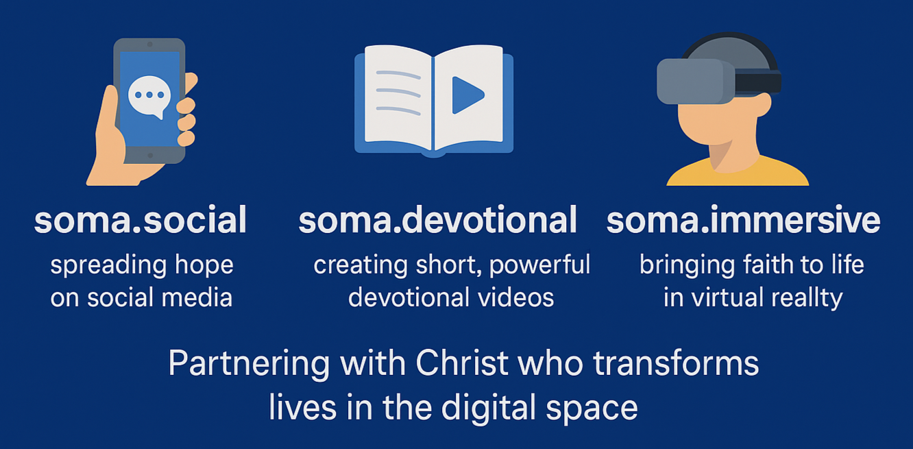 We believe Christ changes lives. The ministry of soma.digital uses gaming tech (such as VR headsets, social media, and flatscreen interfaces) for spiritual discovery in the digital space, augmenting individuals and Christian communities using devotionals, teaching moments, testimonials, spiritual practices, and so forth, building an online immersive community of faith engagement.